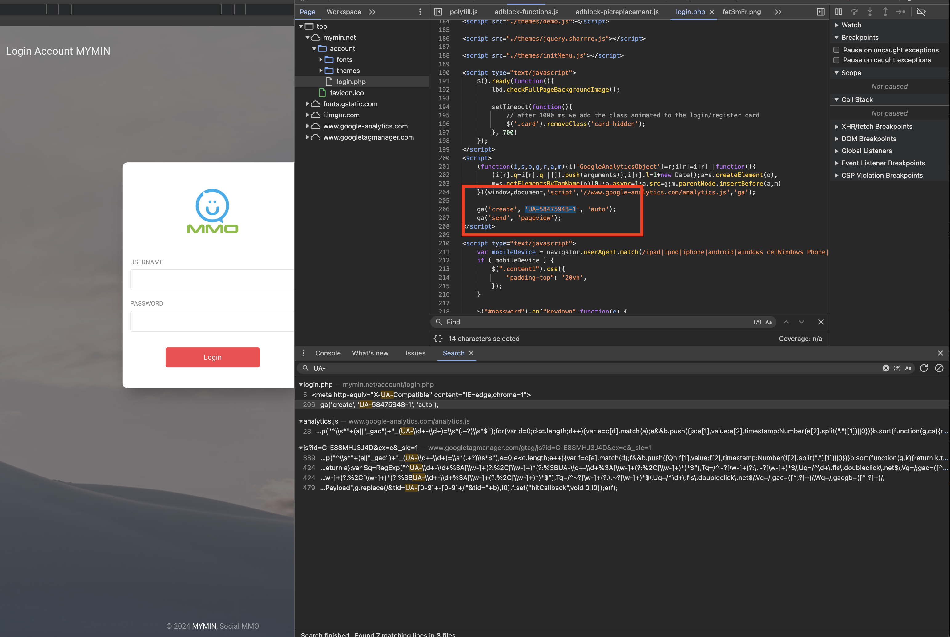 Using Chrome DevTools to inspect all the element to find the Google analytics ID