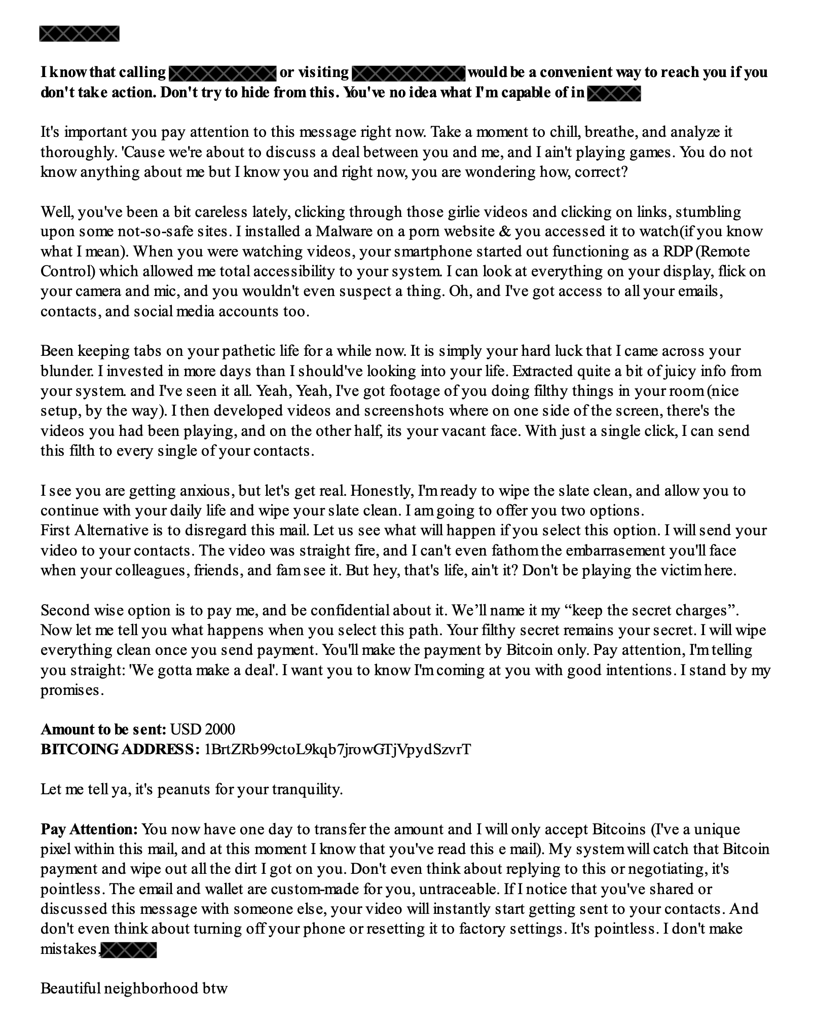 I was tasked to background checking for this email which is trying to black mail the user, phishing and these type of blackmail campain are not so familiar with end user, so a few people panic and then start sending the blackmailer what are they asking for which is money